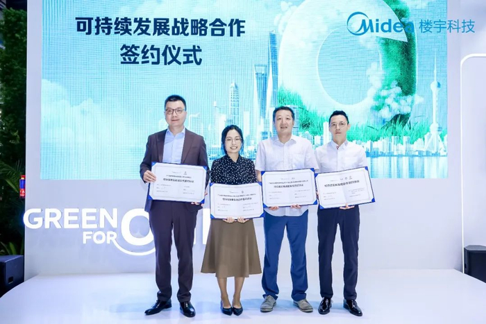 在可持续发展战略合作签约仪式上,SGS通标标准技术服务有限公司(上海)公司总经理牟奇志、南德认证检测(中国)有限公司大中华区可持续发展经理何明珠、必维电子电气服务中国区总经理祝嘉韵与美的楼宇科技研究院院长孟涛,一同上台完成签约仪式。