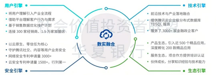 腾讯打造了用户、技术、安全和生态四大引擎,连接用户端和企业端,加强双方的信息流通与服务传递(见图表3)。
