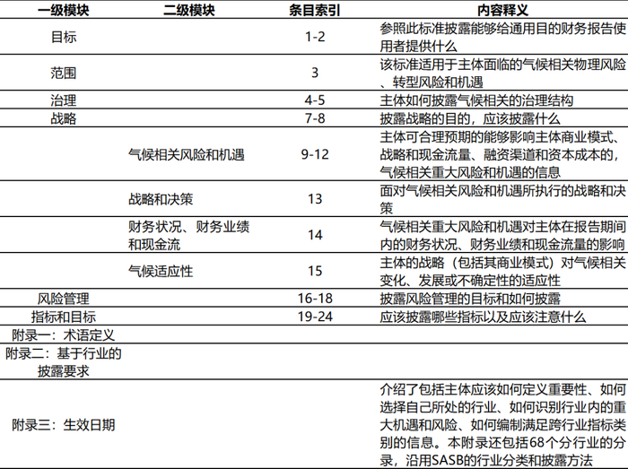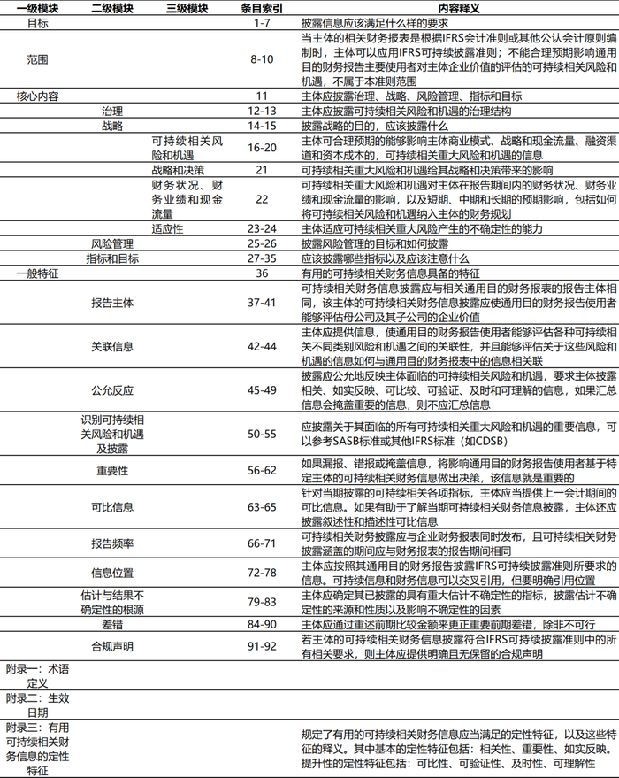 IFRS S1主要要求主体披露其关于可持续相关重大风险和机遇的信息。具体内容上包含征求意见稿、说明指引、结论依据(官方翻译为“结论基础”)三部分,并详述了披露标准和披露原则。披露标准在于描述要披露什么内容以及如何披露,披露原则从整体上描述了有用的信息应该具备什么样的特质。在披露内容上,IFRS S1建议,可持续相关财务信息披露应与相关通用目的财务报表的报告主体相同。例如,如果报告主体是企业集团,合并范围将包括母公司及其子公司。因此,该主体的可持续财务信息披露应使通用目的财务报告使用者能够评估母公司及其子公司的企业价值。在披露频次上,IFRS S1建议,可持续相关财务披露应与企业财务报表同时发布,且可持续相关财务披露涵盖的期间应与财务报表的报告期间相同,披露频次建议为12个月一次。