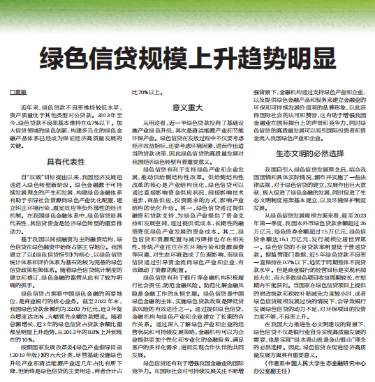 3、绿色信贷有利于增强我国金融也得国际竞争力,促进可持续发展。在国际社会对于可持续发展的关注不断增强的背景下,金融机构通过支持绿色产业和企业,以及提供绿色金融产品和服务来建立金融业的环保和可持续发展价值观的品牌形象,以此能够获得国际社会的认可和赞誉,这有助于增强我国金融业在国际舞台上的声誉和竞争力。同时绿色信贷的高质量发展可以吸引国际投资者和资金流入我国绿色产业和企业。随着全球对可持续发展的需求不断增长,越来越多的投资者将资金配置向绿色经济领域。我国作为全球最大的发展中国家,拥有庞大的绿色产业和市场潜力。通过提供绿色信贷,我国金融机构能够为国际投资者提供绿色投资机会和金融服务,进一步吸引国际资金流入我国市场,提升我国金融业的国际竞争力。同时,绿色信贷也促使金融机构开发符合市场需求的绿色金融产品,丰富金融市场的产品种类。不仅能够提供更多的融资渠道和工具,也为我国金融业提供了更广阔的发展空间和竞争优势。