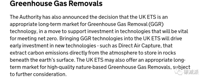 该部门还表明,英国碳排放交易体系可能会进行修改,以纳入温室气体清除“greenhouse gas removal-GGR”技术,但须经过协商并制定“稳健的”测量、报告和验证MRV框架。