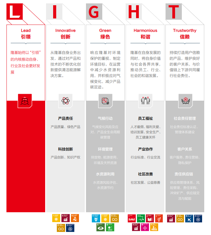 除了完善ESG治理体系,隆基还制定了“LIGHT”可持续发展理念,形成“引领(Lead)”“创新(Innovative)”“绿色(Green)”“和谐(Harmonious)”“信任(Trustworthy)”5项要素,并明确各要素下的实质性议题,围绕实质性议题推动公司可持续发展战略与行业进步、社会共享的深度融合。