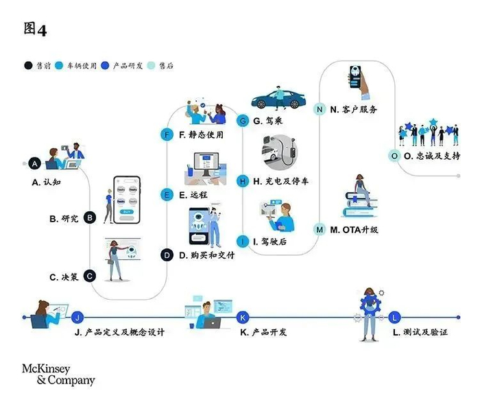 我们沿用户旅程,从售前、使用中、售后以及与用户体验最直接相关的车企产品研发这四个环节,梳理出了15个关键触点: