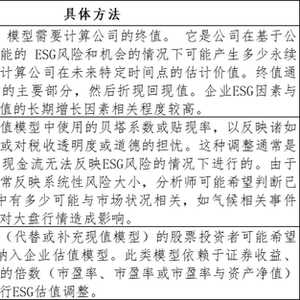 在ESG调整企业估值部分,UN PRI着重介绍了终值调整、风险系数和折现率调整以及相对价值调整3种方法。
