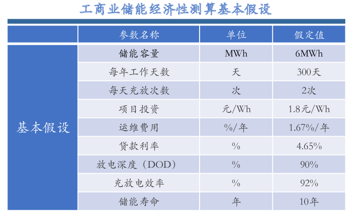 基本假设:投资成本1.8元/Wh,总投资1080万元,其中银行贷款70%,贷款利率4.65%,DOD90%,充放电效率92%,储能寿命为10年。