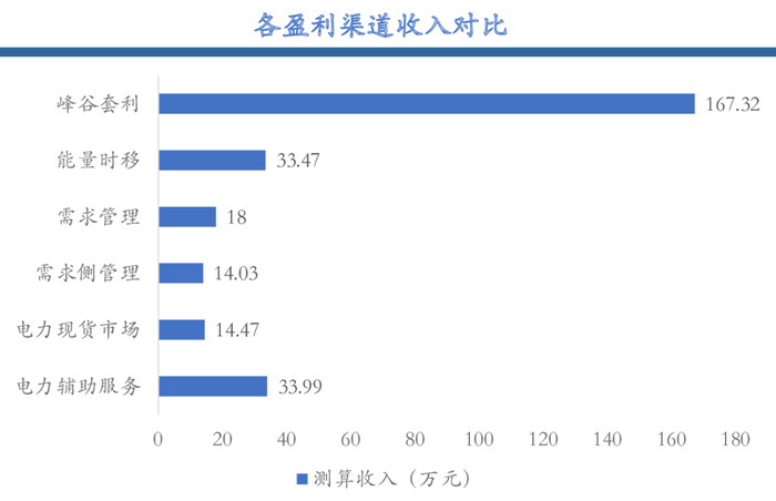 峰谷套利为主要盈利渠道。工商业储能盈利渠道有峰谷套利、能量时移、需求管理、需求侧响应、电力现货市场交易、电力辅助服务等,以浙江省工商业储能项目第一年收入为例,峰谷套利收入167.32万元,能量时移收入33.47万元,需求管理收入18万元,需求侧响应收入14.03万元,电力现货市场交易收入14.47万元,电力辅助服务收入33.99万元,其中峰谷套利收入远超其他盈利方式。此外,工商业储能可作为后备电源使用,但不直接产生经济效益。