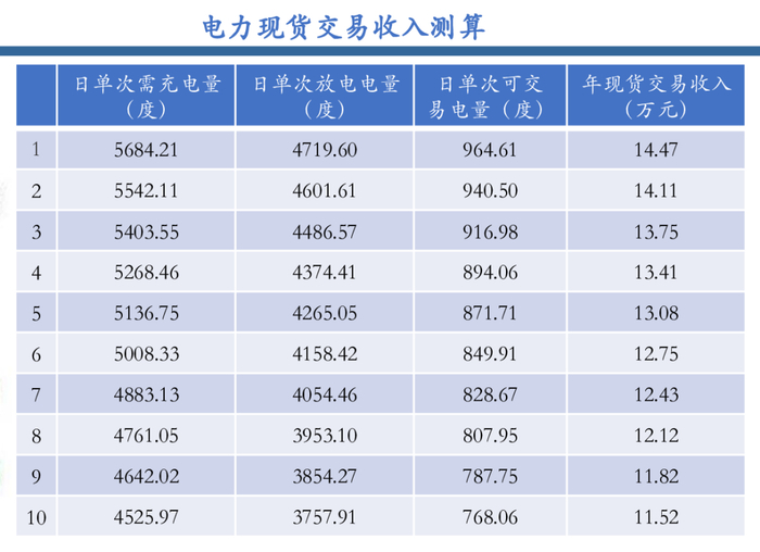 收入测算:假设每日参与一次电力现货交易,交易量为单次充放电电量差,结算价格取0.5元/kWh,第一年电力现货交易收入为14.47万元。