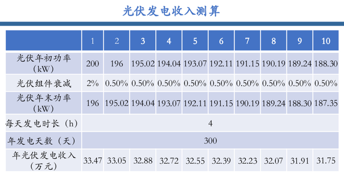 收入测算:假设该工商业用户拥有2000m²屋顶,可配置200kW光伏,光伏组件第一年衰减2%,此后每年衰减0.50%,每天综合发电时长4小时,合计发电800kWh转移至尖峰时段使用,第一年能量时移收入33.47万元。