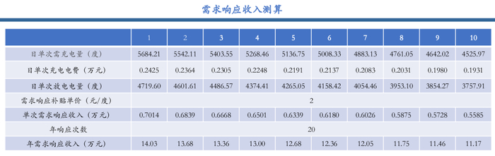 收入测算:假设年度需求侧响应20次,单次需求侧响应最高补贴4元/kWh,测算取平均价格2元/kWh,第一年需求侧响应收入14.03万元。