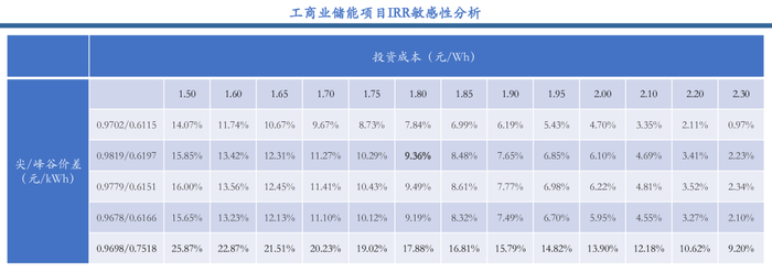 敏感性分析:在仅考虑峰谷套利收入的情况下,当每度尖/峰谷电价差为0.9819/0.6197元,投资成本为1.8元/Wh时,工商业储能项目IRR达9.36%,在全国范围内峰谷价差持续拉大和储能投资成本不断下降的趋势下,有望将IRR提升至20%以上,工商业储能经济性愈发明显。