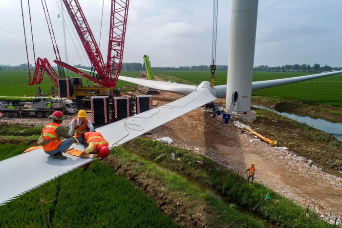 ▲江苏省淮安市组装风力涡轮机的现场。可再生能源设施的运营成本比化石燃料设施低得多。图片来源:He Jinghua / Alamy