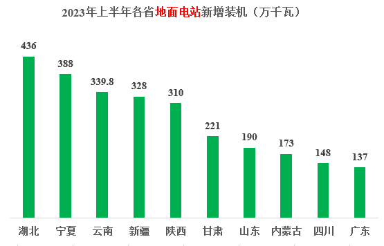 2023年上半年地面电站装机3746万千瓦,前三的省份分别为:湖北、宁夏、云南;前十省份合计2672万千瓦,占到全国新增光伏装机的71%。新增光伏总装机前十省份的具体情况如下图所示。