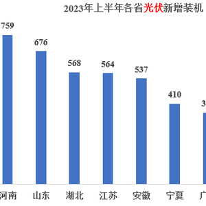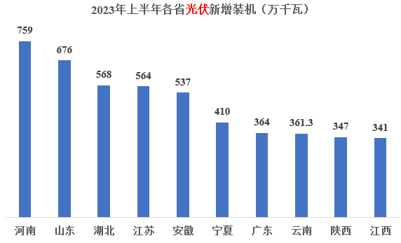 2023年上半年总装机为7842万千瓦,前三的省份分别为:河南、山东、湖北;前十省份合计4927万千瓦,占到全国新增光伏装机的63%。新增光伏总装机前十省份的具体情况如下图所示。
