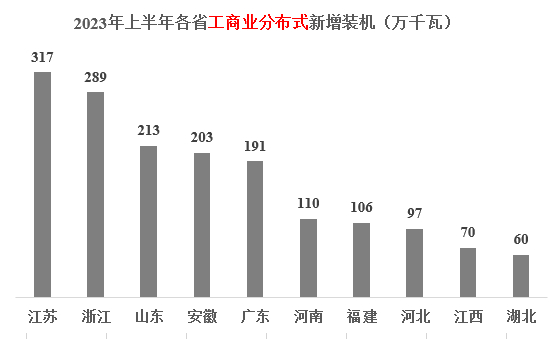 2023年上半年工商业分布式光伏装机规模为1944万千瓦,前三的省份分别为:江苏、浙江、山东;前十省份合计1656万千瓦,占到全国新增光伏装机的85%。新增光伏总装机前十省份的具体情况如下图所示。