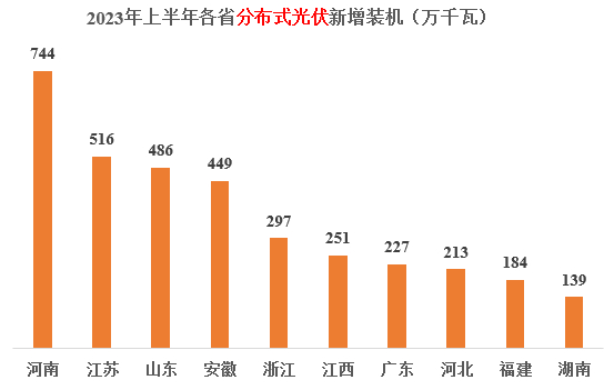 2023年上半年新增分布式光伏装机规模为3506万千瓦,前三的省份分别为:河南、江苏、山东;前十省份合计3506万千瓦,占到全国新增光伏装机的86%。新增光伏总装机前十省份的具体情况如下图所示。