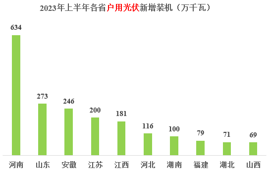 2023年上半年户用装机规模为2152万千瓦,前三的省份分别为:河南、山东、河北;前十省份合计1969万千瓦,占到全国新增光伏装机的91%。新增光伏总装机前十省份的具体情况如下图所示。