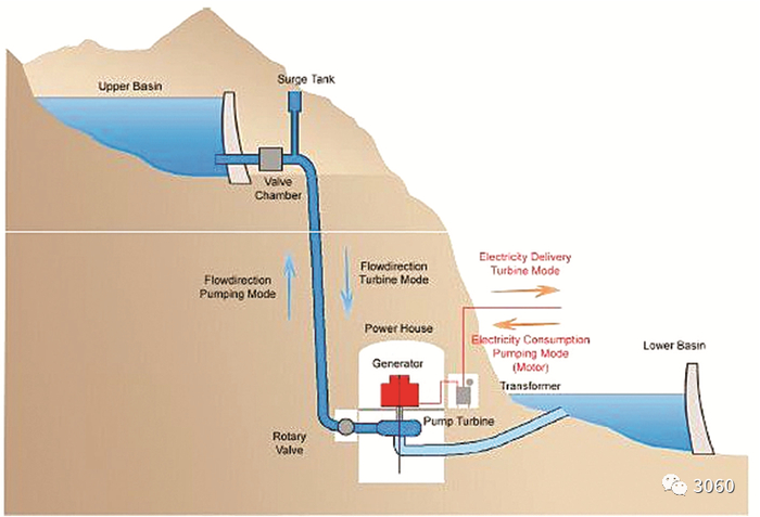 抽水蓄能是现今发展成熟且具规模的储能技术。抽水蓄能电站一般由上水库、下水库和可逆式水泵水轮机组成。用电低峰期时,将可逆式水泵水轮机作为水泵,利用低价值电能将水从下水库抽至上水库,储存水的势能;用电高峰期时则将可逆式水泵水轮机作为水轮机,在上水库开闸放水,将水的势能转换为高价值电能。抽水蓄能具有技术优、成本低、寿命长、容量大、效率高等优点,可适应各种储能周期需求,系统循环效率可达70%~80%。抽蓄电站坝体可使用100a左右,预计电机等设备使用年限为40~60a。截至2021年底,中国储能装机总规模达到46.1GW,其中抽水蓄能占比86.3%。