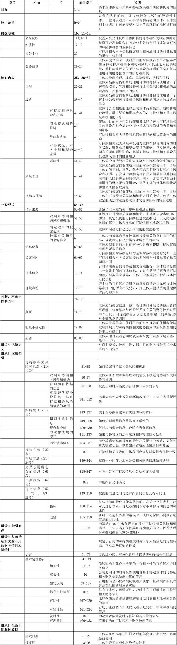 IFRS S1是ISSB准则中体现“一般标准要求”的文件,要求企业识别并披露他们在短期、中期和长期面临的可持续发展风险和机遇,确保企业向投资者提供与决策相关的信息1。从发布的终稿中可以发现,1)IFRS S1内容结构有所调整。将原来的“一般特征”拆分为“概念基础”、“一般要求”、以及“判断、不确定性与差错”三章;2)IFRS S1增加了一些全新章节。新增“指引来源”一节,以及“附录B 应用指引”和“附录C 指引来源”两个附录;3)IFRS S1终稿逻辑条理更清晰。“一般特征”的拆分使其更具指标性和条理性、“附录B 应用指南”的新增使得报告正文部分更简洁明了,“附录C 指引来源”的新增提供了对标其他标准的桥梁。IFRS S1终稿内容简介见表1。