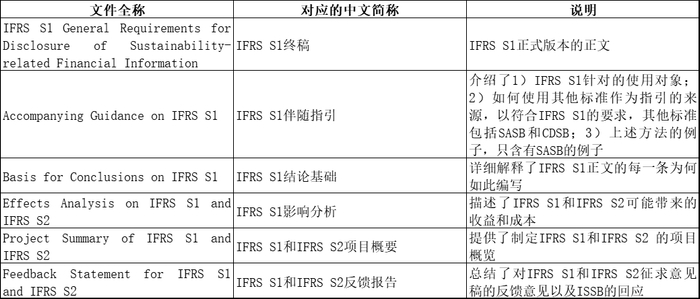 无论是在征求意见稿还是终稿中,ISSB均发布了相关一系列附件,共同构成准则的系列文件。表2列出了与IFRS S1终稿相关的系列文件。总体来看,1)IFRS S1结论基础变动较大。由于IFRS S1终稿较征求意见稿有改动,且IFRS S1结论基础是对应IFRS S1终稿里的每一条撰写的,故IFRS S1结论基础也随之改动;2)更名IFRS S1系列文件。IFRS S1征求意见稿中的“说明指引”(Illustrative Guidance)更名为“伴随指引”(Accompanying Guidance),且内容有所扩展;3)补充IFRS S1相关系列文件。ISSB补充了用于分析可能带来收益和成本的“影响分析”。