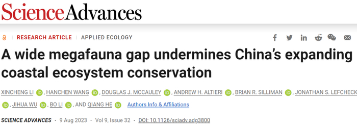 标题:A wide megafauna gap undermines China’s expanding coastal ecosystem conservation
