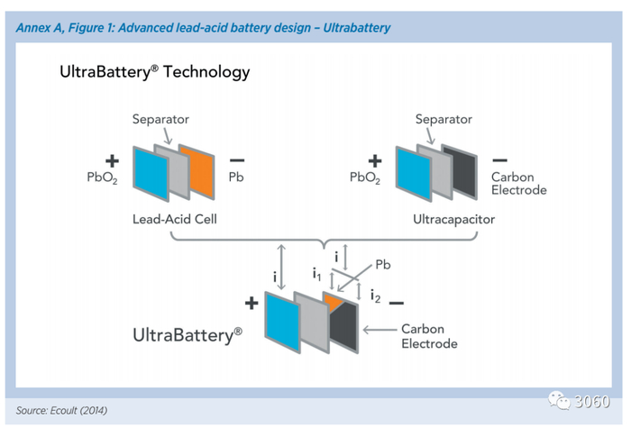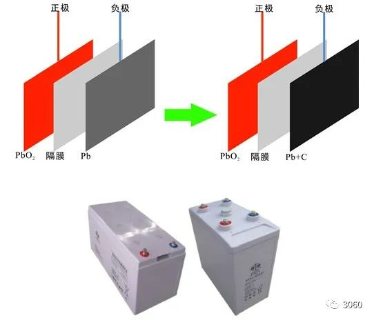 铅炭电池是一种电容型铅酸电池,是从传统的铅酸电池演进出来的技术。普通铅酸电池的正极活性材料是氧化铅(PbO2),负极活性材料是铅(Pb),若把负极活性材料Pb全部换成活性炭,则普通铅酸电池可变成混合电容器;若把活性炭混合到负极活性材料Pb中,则普通铅酸电池可变成铅炭电池。铅炭电池同时具有铅酸电池和电容器的特点,即拥有超级电容能瞬间大容量充电的优点,也发挥了铅酸电池的比能量优势,充放电性能好、电池寿命也长于铅酸电池。中国高性能铅炭电池在微网储能项目中也有应用。