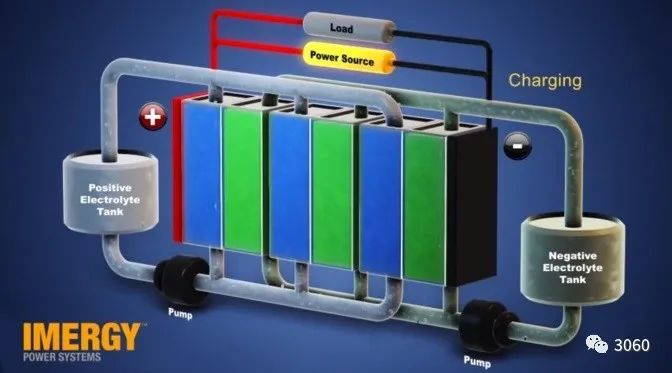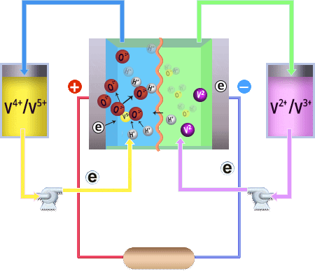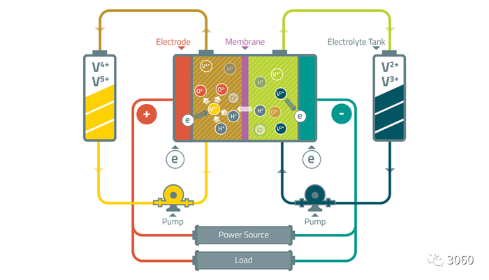 钒液流电池储能安全寿命长,适合新能源电站储能。电能以化学能的方式存储在不同价态钒离子的硫酸电解液中,通过外接泵把电解液压入电池堆体内,在机械动力作用下,使其在不同的储液罐和半电池的闭合回路中循环流动。采用质子交换膜作为电池组的隔膜,电解质溶液平行流过电极表面并发生电化学反应,通过双电极板收集和传导电流,从而使储存在溶液中的化学能转换成电能。可逆的反应过程使钒电池顺利完成充电、放电和再充电。