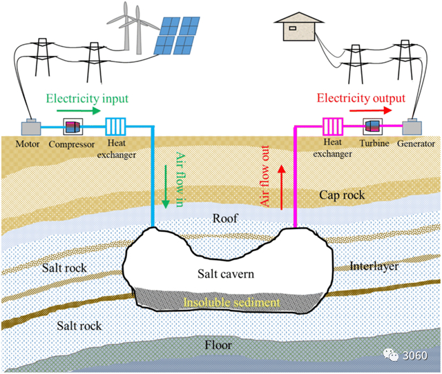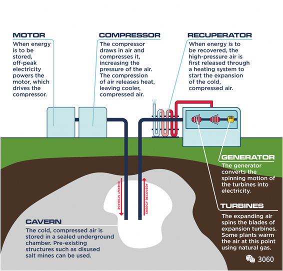 压缩空气储能将成为大规模储能的重要补充。压缩空气储能是一种基于燃气轮机发展而产生的储能技术,以压缩空气的方式储存能量。储能时段,压缩空气储能系统利用风/光电或低谷电能带动压缩机,将电能转化为空气压力能,随后高压空气被密封存储于报废的矿井、岩洞、废弃的油井或人造的储气罐中;释能时段,通过放出高压空气推动膨胀机,将存储的空气压力能再次转化为机械能或者电能。压缩空气主要由压缩系统、膨胀系统、发电以及储气罐四大核心部分组成。中国已建成1.5,10,100MW先进压缩空气储能示范项目。
