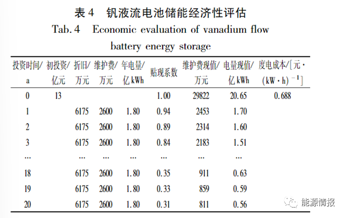钒液流电池储能电站经济性评估(表4),由于尚未规模化商用,且受制于设备、产能以及高额的前期投入,目前钒电池初始成本约为锂电池的3倍。按10MW/400(MW・h)项目初始投资成本13元/W,年运维成本0.065元/W,寿命为20a,玄幻次数可达12000次以上,残值为5%,每年运行次数600次,放电深度100%,储能循环效率70%等条件,对钒液流电池储能电站进行财务经济性评价建模,测算储能度电成为约为0.688元/(kW・h)。