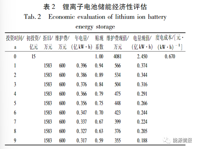 锂离子电池储能电站的经济性评估(表2),按100MW项目初始投资成本1.5元/(Wh),年运维成本0.06元/W,寿命为9a,残值为5%,每年运行次数500次,放电深度90%,储能循环效率88%,寿命终止容量75%等条件,对锂离子电池储能电站进行财务经济性评价建模,测算储能度电成本约为0.67元/(kW・h)。