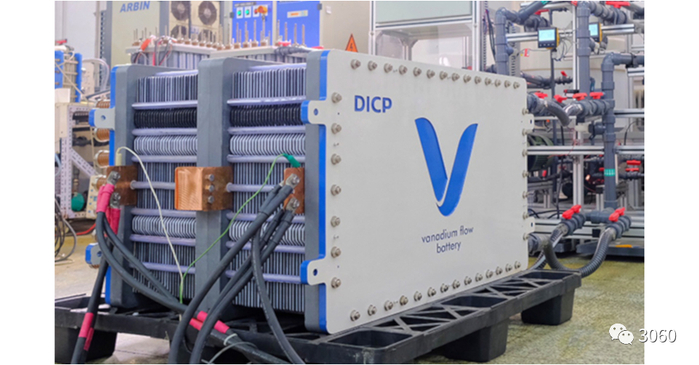 全钒液流电池系统中,钒电解液全生命周期内不会失效变质,理论上总钒量不会发生变化,易于回收利用,价值较高。钒液流电池具有寿命长、安全性好、输出功率大、储能容量大且易于扩展等特点,寿命达15~20a,适合用于风电、光伏电站储能,满足其频繁充放电、大容量、长时间储能需求。但是,反液流电池能量密度低,体积、质量远大于其他电池,需要5°~40°的温度环境。中国钒液流电池已在智能电网、通信基站、偏远地区供电、可再生能源及削峰填谷等项目中成功应用,并建成大连10MW/400(MW・h)的全球最大钒液流储能项目。