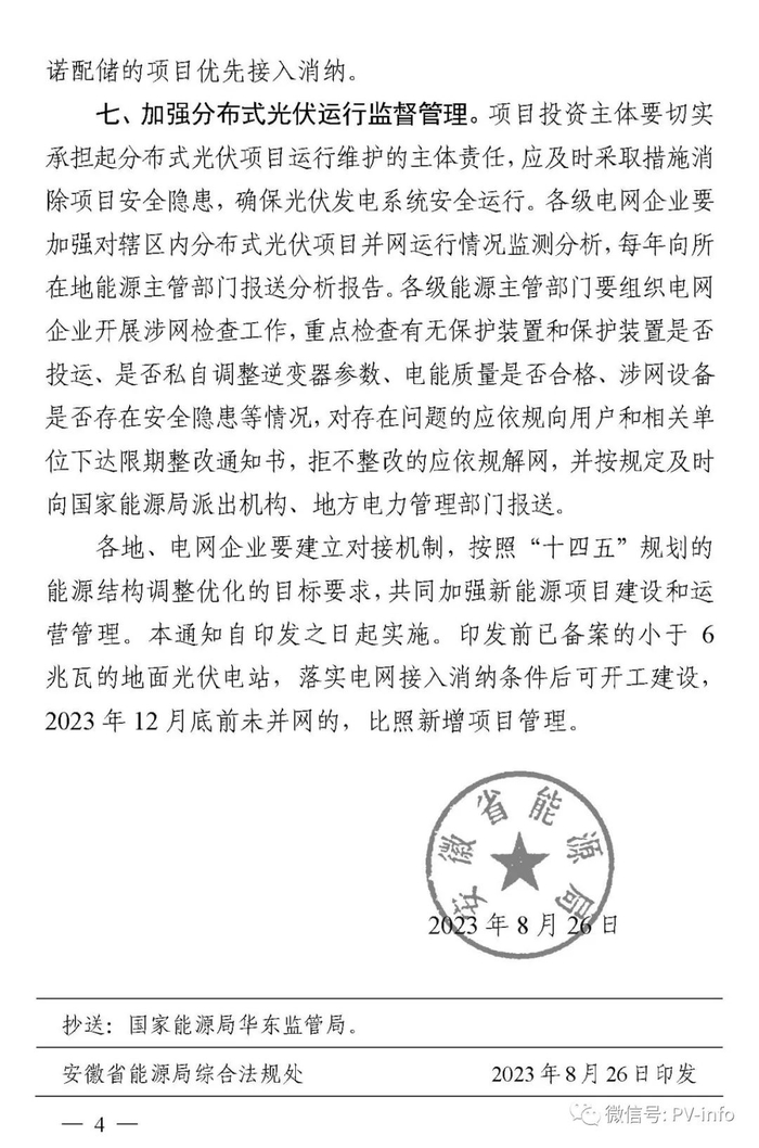 8月26日,安徽省能源局下发《关于进一步推进分布式光伏规范有序发展的通知》(皖能源新能〔2023〕33号),对分布式光伏项目管理进行调整