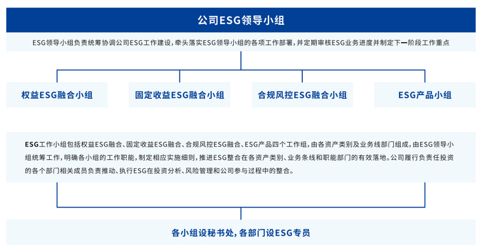 围绕公司战略和业务目标,南方基金设立了由总经理牵头并负责的“ESG领导小组+ESG工作小组”的双层级领导架构,由不同业务条线的高管分别推动ESG在权益、固收、产品、风控等业务条线的落地;此外,公司设立了可持续发展部作为公司ESG推进的专职部门,统筹规划并实际推进全公司ESG投资业务体系的搭建,该设置在国内资管行业处于领先位置。
