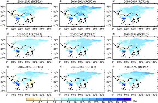 多模式集合预估的“一带一路”区域RCP2.6(a-c)、RCP4.5(d-f)和RCP8.5(g-i)情景下2016~2035年(a,d,g)、2046~2065年(b,e,h)和2080~2099年(c,f,i)降水量的相对变化(单位:%;相对于1986~2005年)(周波涛等,2020)