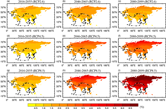 多模式集合预估的“一带一路”区域RCP2.6(a-c)、RCP4.5(d-f)和RCP8.5(g-i)情景下2016~2035年(a,d,g)、2046~2065年(b,e,h)和2080~2099年(c,f,i)的年平均气温变化(单位:℃;相对于1986~2005年)(周波涛等,2020)