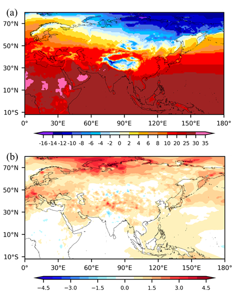 “一带一路”区域2022年平均气温(a)及气温距平(b,相对于1981~2010年)空间分布(单位:℃,基于CRA-LAND数据)