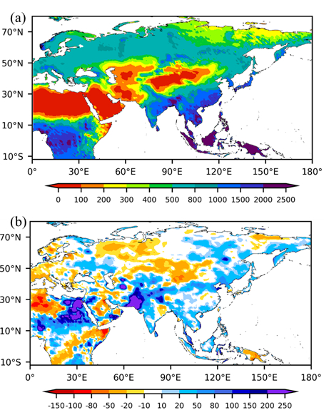 “一带一路”区域2022年降水量(a,单位:毫米)及降水量距平百分率(b,单位:%,相对于1981~2010年)空间分布(基于CRA-LAND数据)