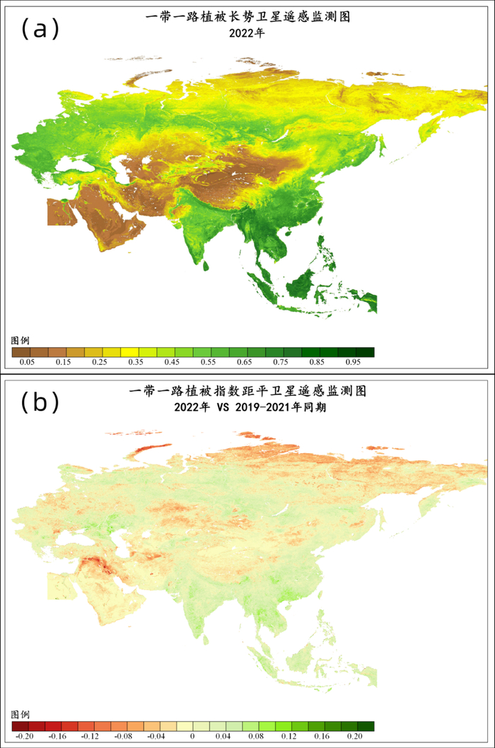 2022年“一带一路”区域归一化植被指数(a)及距平(b,与2019~2021年同期相比)空间分布(基于FY3D卫星数据)