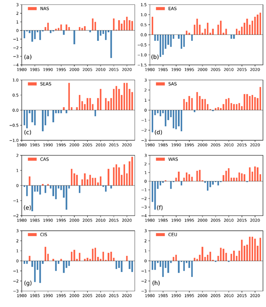 1981~2022年“一带一路”区域各地区年平均气温距平变化(单位:℃,相对于1981~2010年,基于GSOD-Global Surface Summary of Day Data数据)。注:图中8个子区域分别为:东亚(EAS)、南亚(SAS)、东南亚(SEAS)、中亚(CAS)、西亚(WAS)、北亚(NAS)、中东欧(CEU)和独联体欧洲区域(CIS),下同。