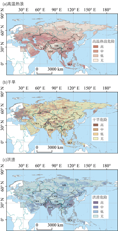 “一带一路”陆域RCP8.5情景下未来(2021~2050年)极端事件(a:高温热浪;b:干旱;C:洪涝)危险空间分布(吴绍洪等,2019)。注:图中分区的缩写为:中东欧寒冷湿润区(CEE)、蒙俄寒冷干旱区(MR)、中亚西亚干旱区(CWA)、东南亚温暖湿润区(SEA)、巴基斯坦干旱区(PAK)、孟印缅温暖湿润区(BIM)、中国东部季风区(CNE)、中国西北干旱区(CNW)、青藏高原区(TIB)。