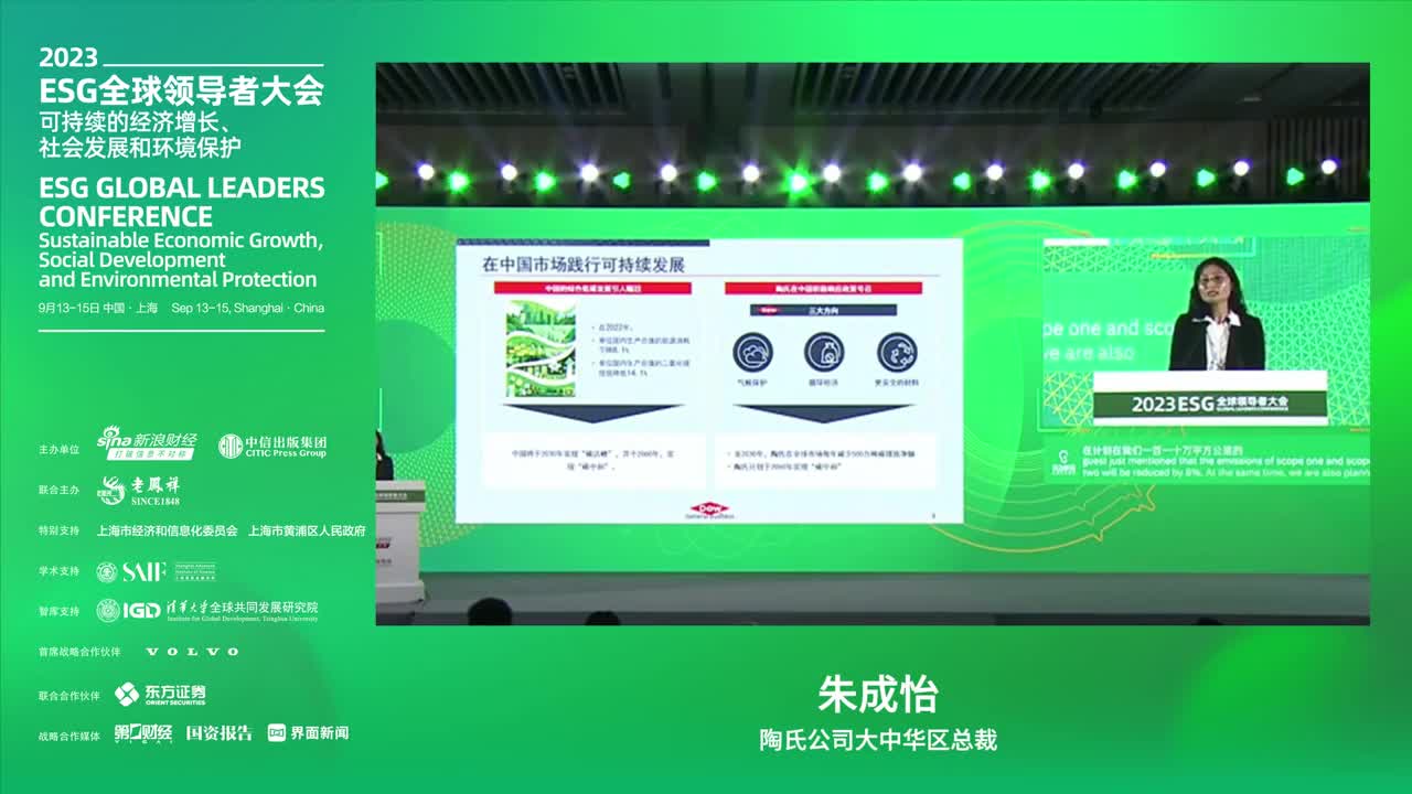2023ESG全球领导者大会于9月13至15日在上海市黄浦区绿地外滩中心举行,本次大会主题为“可持续的经济增长、社会发展和环境保护”。本次大会由新浪财经、中信出版集团主办,老凤祥联合主办,上海市经济和信息化委员会、上海市黄浦区人民政府特别支持。陶氏公司大中华区总裁朱成怡出席并发表演讲。