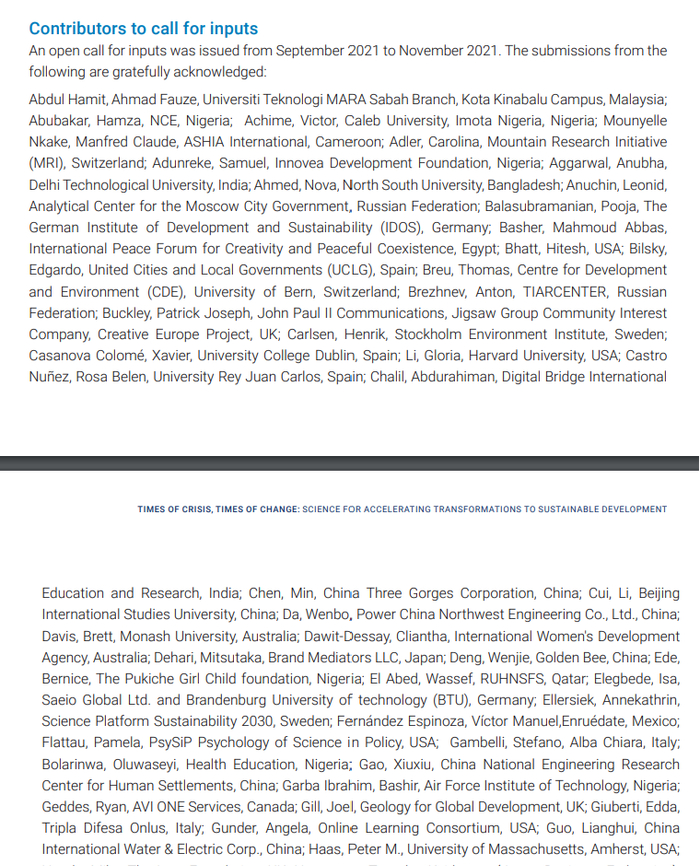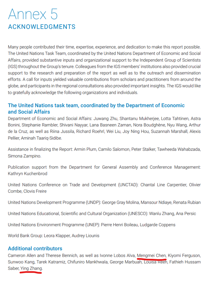 除了潘家华学部委员作为IGS成员列入报告作者团队之外,参与支持工作的张莹、陈梦玫也被列入报告支持贡献作者名单。参与案例推荐工作的所有中国单位及相关研究和工作人员也都被完整列入报告附件中的案例征集贡献者目录。