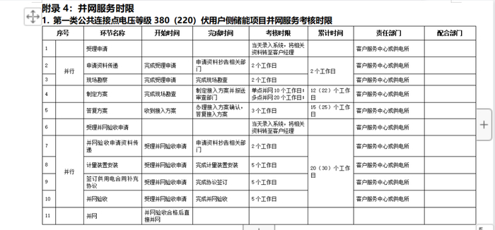 1.优化接网服务流程。畅通并网服务渠道,为用户侧储能提供政策咨询、并网申请、手续办理等“一站式”并网服务。优化用户侧储能并网服务流程,规范开展并网申请受理、接入系统方案答复、设计审查、合同签订、计量安装、并网验收等环节业务;公共连接点电压等级380(220)伏的项目采用典型接入系统方案,并取消工程设计审查环节。在工程设计审查环节,重点审查设计内容与接入系统方案的一致性。在并网验收环节,重点检验项目合法合规性文件、储能装置型式试验报告、接网设备设施试验报告。