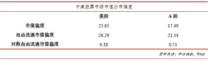 国内外股票市场市值一般都呈幂律分布,一方面有少量超大市值的股票,另一方面在小市值段则有明显的长尾现象。我们分别计算美国和中国股票市场自由流通市值的偏度,分别达26.29和21.14,严重右偏。