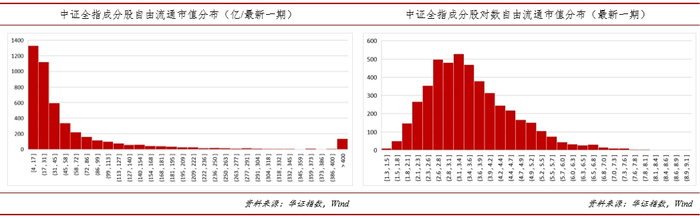 这样既能保留原先各成分股之间的顺序(对大市值股票赋以更高权重);又能调整样本之间的距离,使得分布更匀称,提高指数代表性;另外,相比于等权处理,对数市值加权方法还能提升指数的投资性。