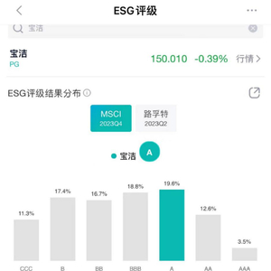 在新浪财经ESG评级中心查询,目前宝洁的ESG评级分数位居行业中上游。以国际权威评级机构MSCI为例,宝洁ESG评级总分为(A),为行业ESG的优秀者。宝洁也致力于创造一个可持续的未来,让地球家园变得更加美好。目前,宝洁正与多方携手致力于推进可持续发展,并积极开拓新的市场机会。例如,联合头部行业协会和头部企业共同发起“软塑新生”项目,与大润发等合作伙伴联合打造环保主题活动“生活小行动地球大不同”,并积极参与到中国首个本土绿色再生塑料产销监管链标准的制定中,进一步健全我国绿色再生塑料规范体系。这是宝洁衔接ESG理念的典型案例,通过科技的全面升级,助力中国长期高质量的发展,成为社会上一股积极向上和向善的力量。