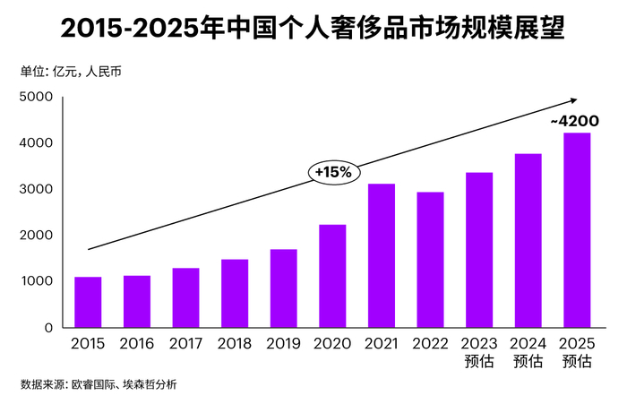 随着中国经济持续向好,中国奢侈品市场正迎来稳健复苏。预计到2025年,以成衣、皮具、珠宝及腕表为代表的中国高端奢侈品市场规模将达到4200亿元1。