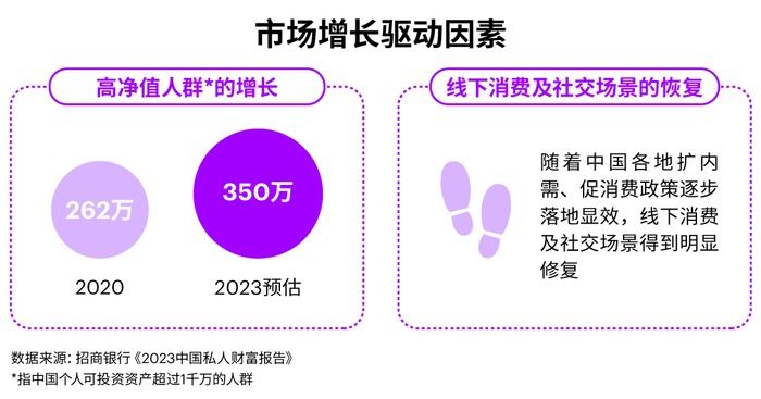 高净值人群的增长、线下消费及社交场景的恢复是市场增长的两大驱动因素。中国高净值人群不断壮大,成为推动我国奢侈品市场稳健增长的主要动能,预计个人可投资资产超过一千万元的人数在2023年将达到350万2。消费者重返实体店铺,也使得线下购物体验和社交互动再次成为奢侈品消费场景的重要构成。