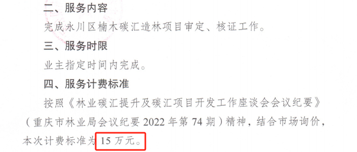 2023年11月21日,重庆永川区楠木碳汇造林项目审定、核证公开选取【林业调查规划设计,碳排放核查及复查】机构,项目审定、核查的费用是15万元。