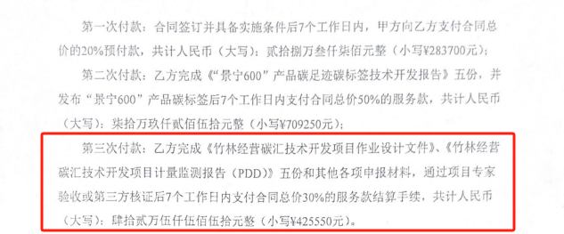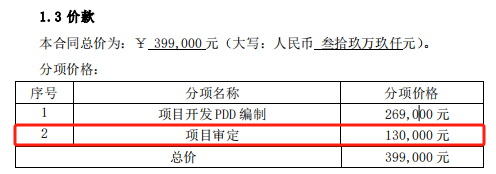 2023年10月12日,《安庆市林业碳汇项目开发技术咨询与服务支持项目》合同显示,项目开发PDD编制的价格是26.9万。
