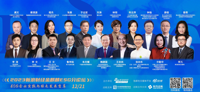 有鉴于此,新浪财经将于2023年12月21日(周四)在北京举办2023新浪财经金麒麟ESG分论坛(点击观看论坛),围绕“ESG企业实践与绿色发展变革”展开深入讨论。论坛邀请中国财政部原副部长朱光耀,商务部原副部长、中国国际经济交流中心副理事长魏建国,全国社保基金理事会原副理事长王忠民,东方证券总裁鲁伟铭,中国人民大学重阳金融研究院执行院长、中国金融学会绿色金融专业委员会秘书长王文等重磅嘉宾,共议ESG企业实践与变革。